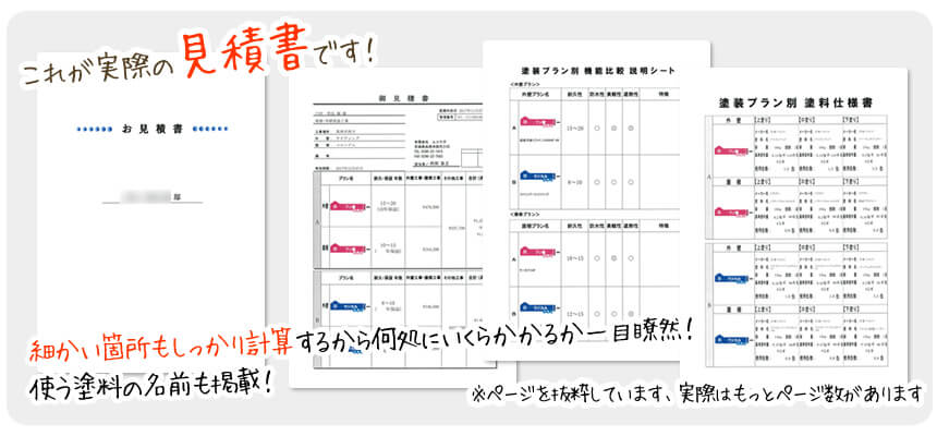 また、どのような塗料があるかわからないお客様も多いので、3~5パターンの見積書を作り、塗料別に特徴などをご説明させていただきます。