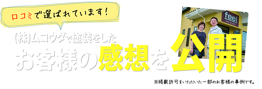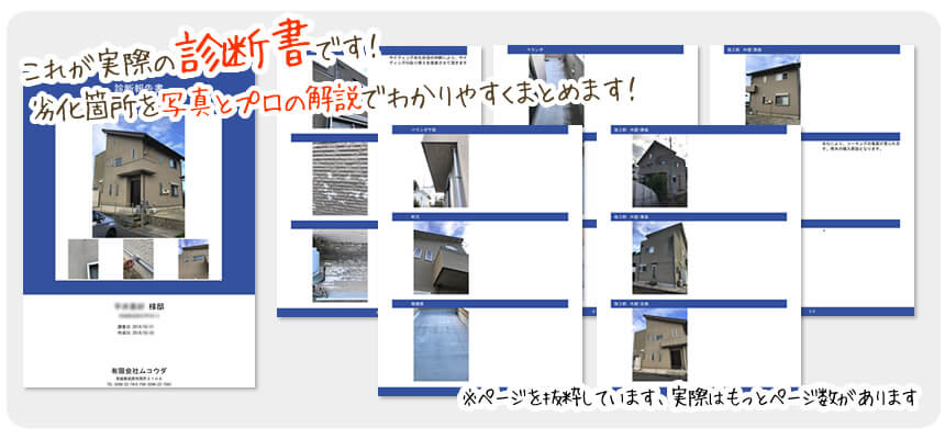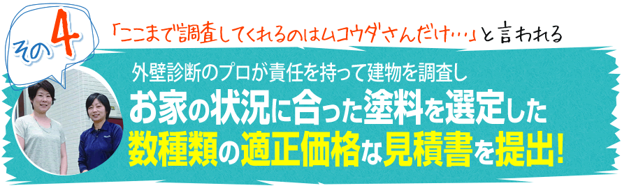 塗装を長持ちさせるためには、まず最初に現在の建物の劣化状況を把握することが大切です。そのため、ムコウダでは外壁診断のプロが徹底調査します。また、前回の塗料に変なものが使われていたり、劣化が進ん出いる場合は、塗料メーカーの担当者と一緒に建物をチェックして補修方法を選ぶこともあります。