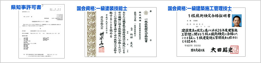 塗装に関する技術や知識面を証明する国家資格として一級塗装技能士、施工管理力を認められた一級施工管理技士の資格を代表の私が保有しています。