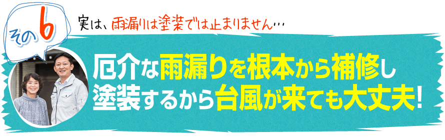 もし、雨漏りがある場合や雨漏りの不安がある方は、私どもに依頼いただければ、雨漏りの原因となる箇所を根本から補修してから塗装するので、新築のように蘇り綺麗で丈夫なお家になり、台風が来ても安心して暮らすことができます。